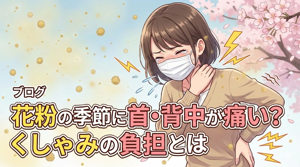 花粉の季節の首・背中の痛みは、花粉症そのものだけでなく、くしゃみや鼻をかむ動作、前かがみ姿勢、浅い呼吸が重なって起こることがあります。