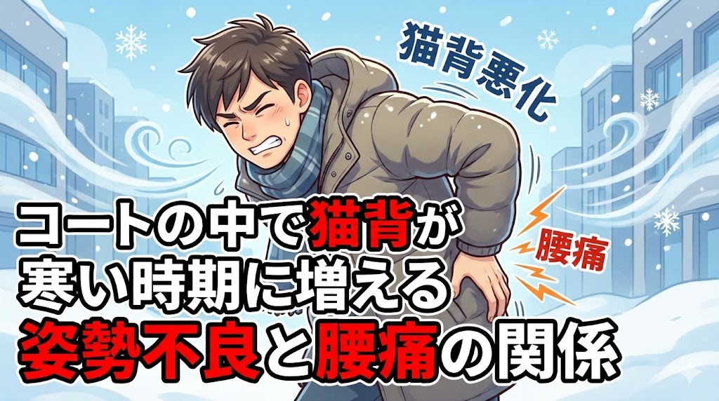 冬のコートの中での猫背や姿勢不良は、見た目の問題だけでなく、腰痛や背中の重だるさにつながりやすい大切なサインでもあります。